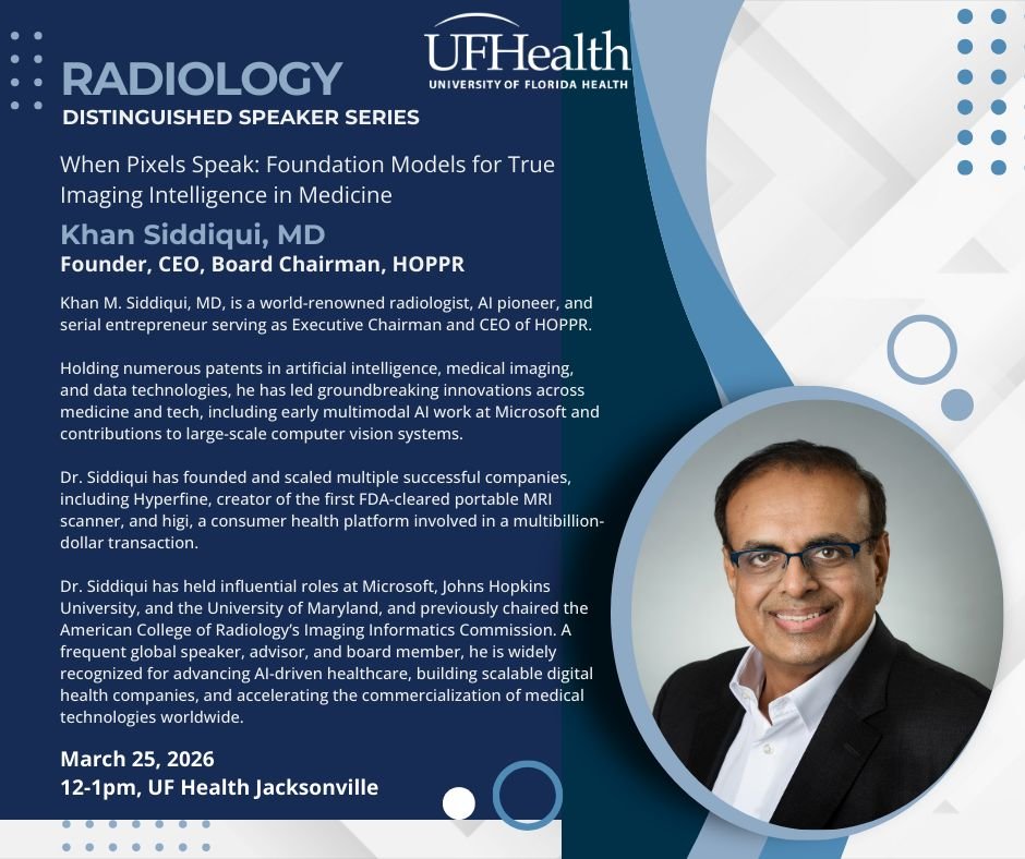 UF Health Radiology is honored to welcome Khan Siddiqui, MD, Founder, Executive Chairman, and Chief Executive Officer of HOPPR, as a featured speaker in the UF Health Radiology Distinguished Speaker Series
